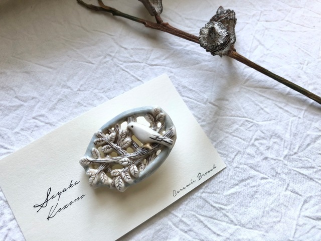小園さやか ブローチ2.赤い実と白い鳥 緑
