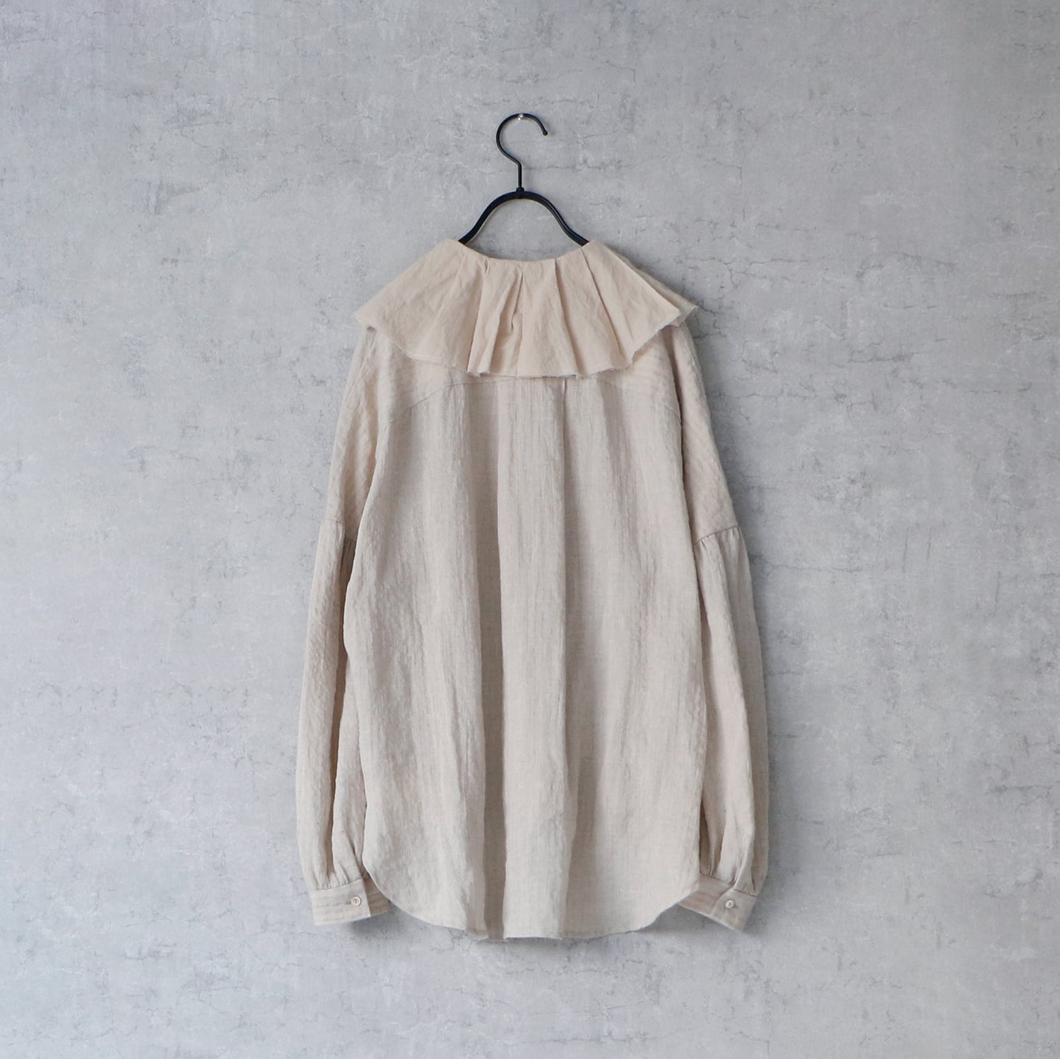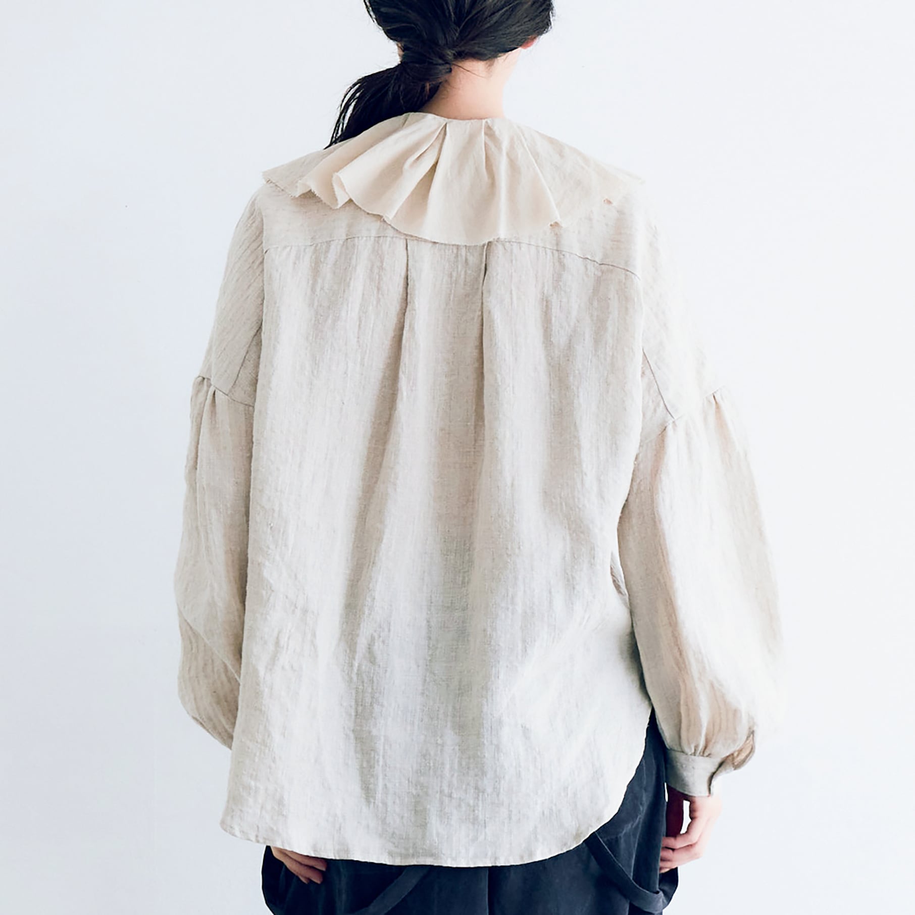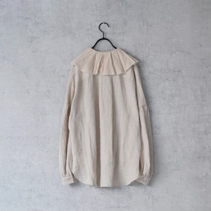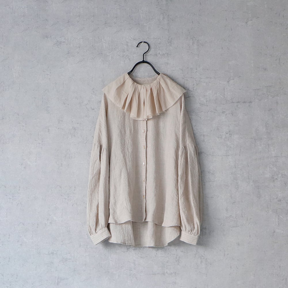 古びたアンティークのような切りっぱなしのフリルが大変美しいクラシカルなリネンブラウス。