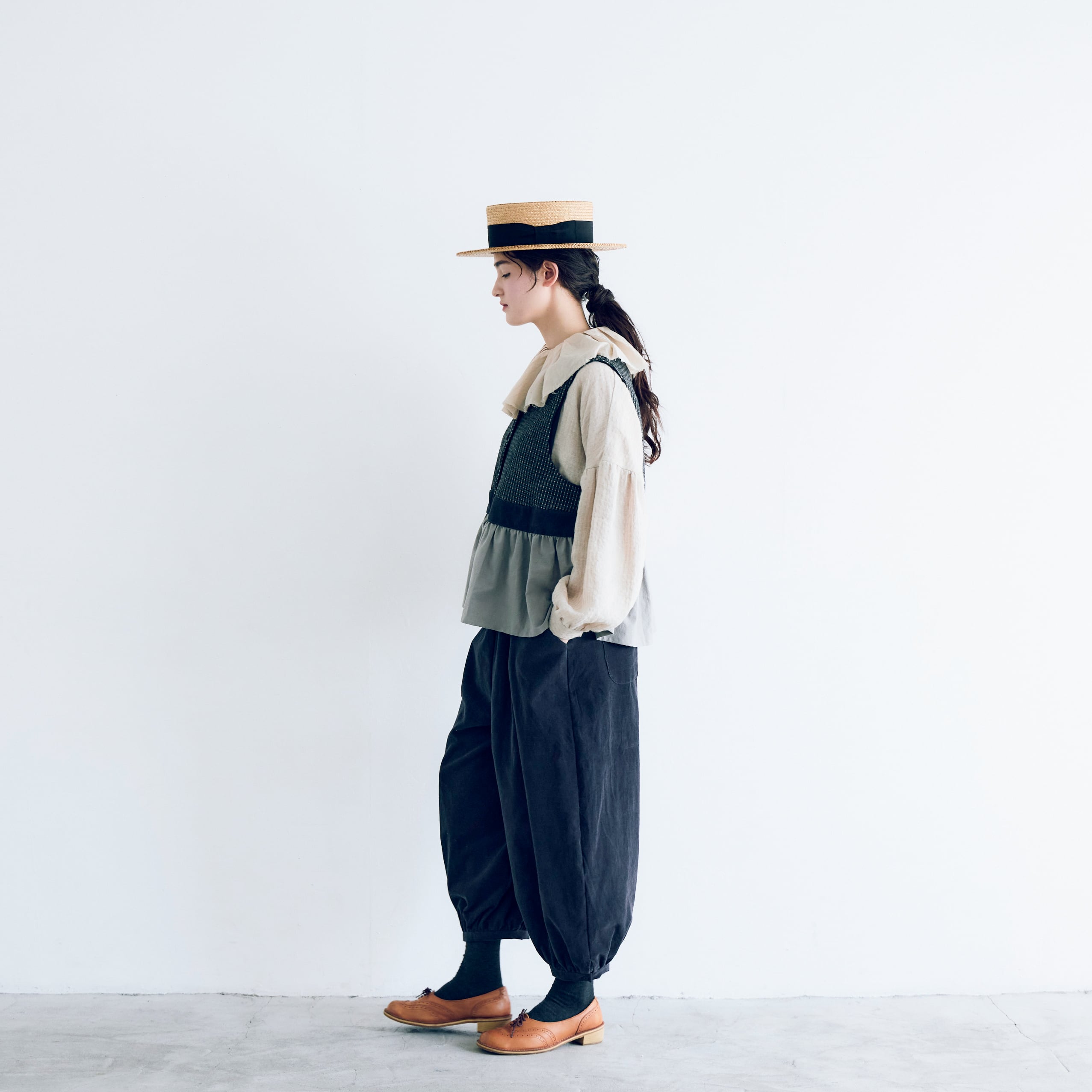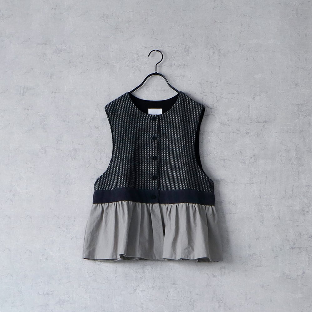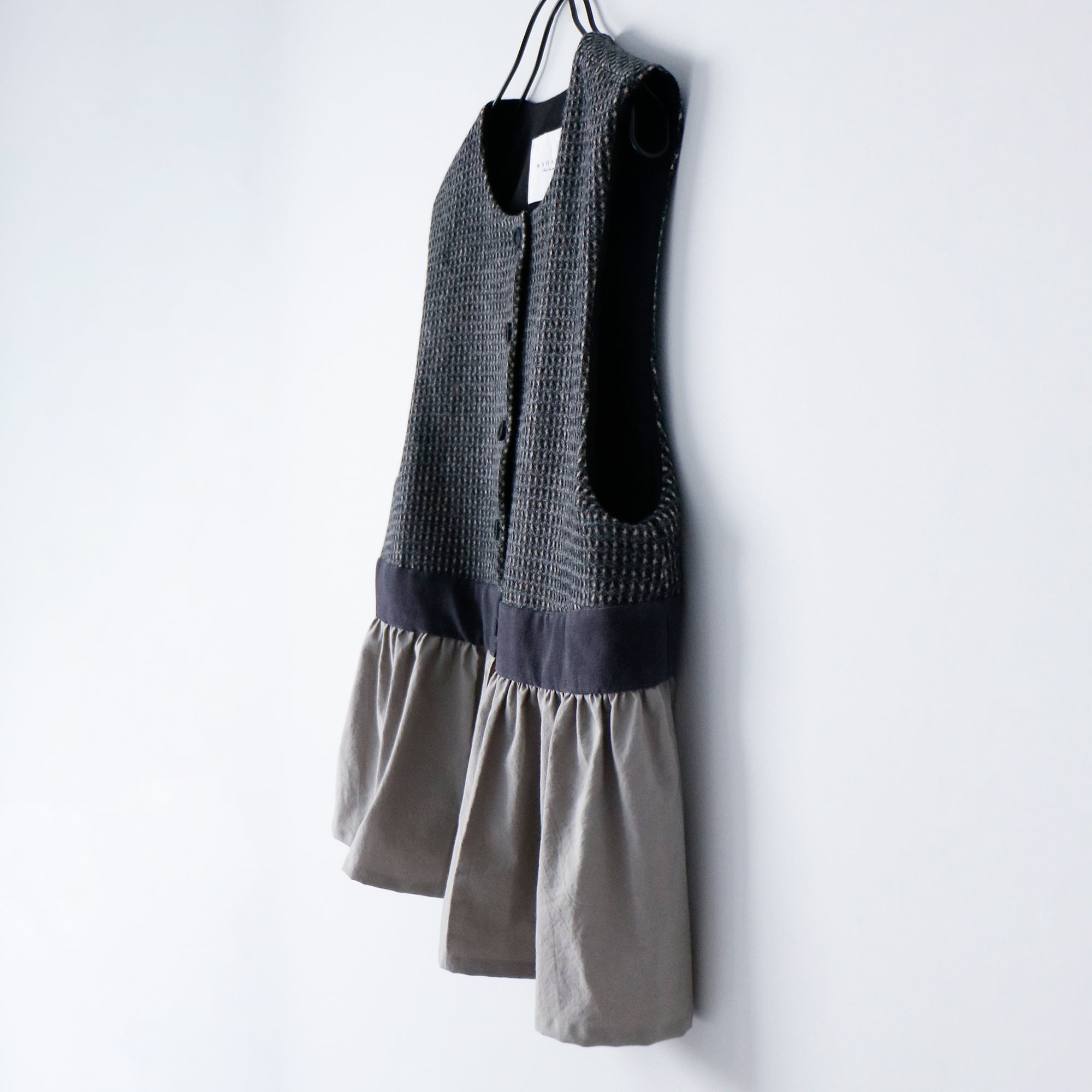 3種類の布地を縫い合わせて出来上がったジレは、素朴でそれでいてどこにもない愛らしい佇まいです。