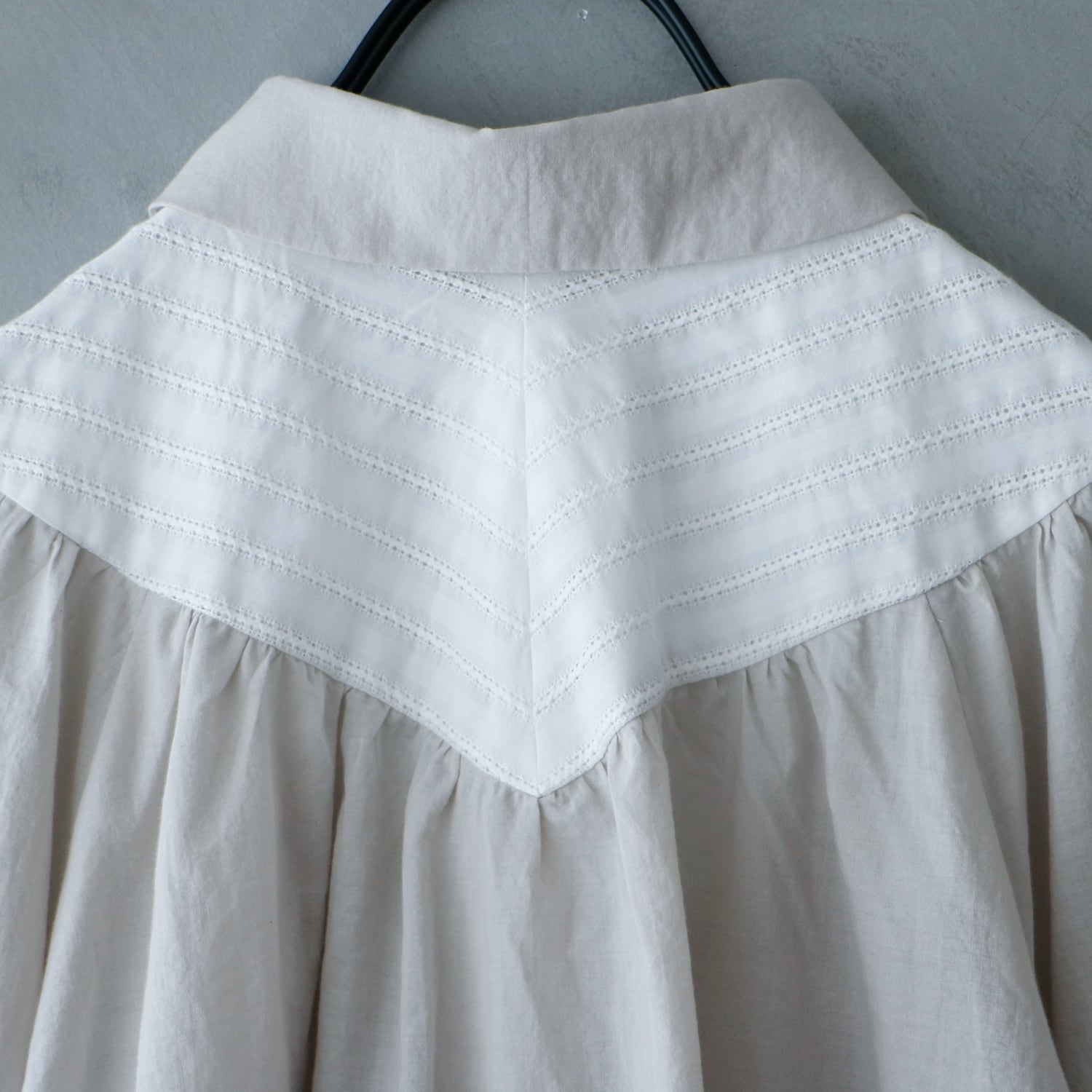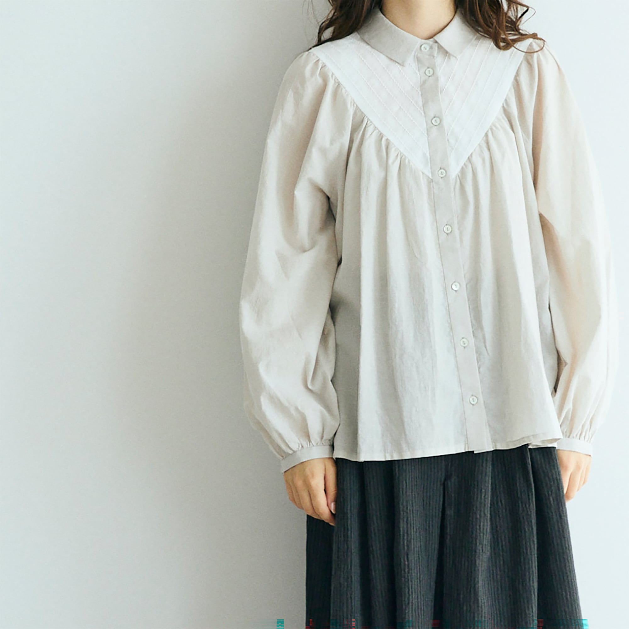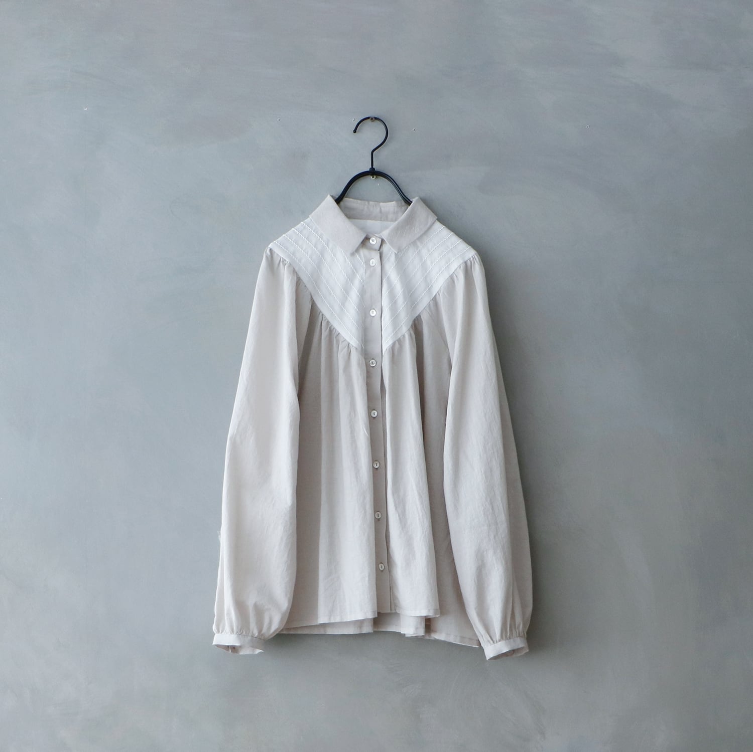 ヨークから流れる繊細なギャザーが