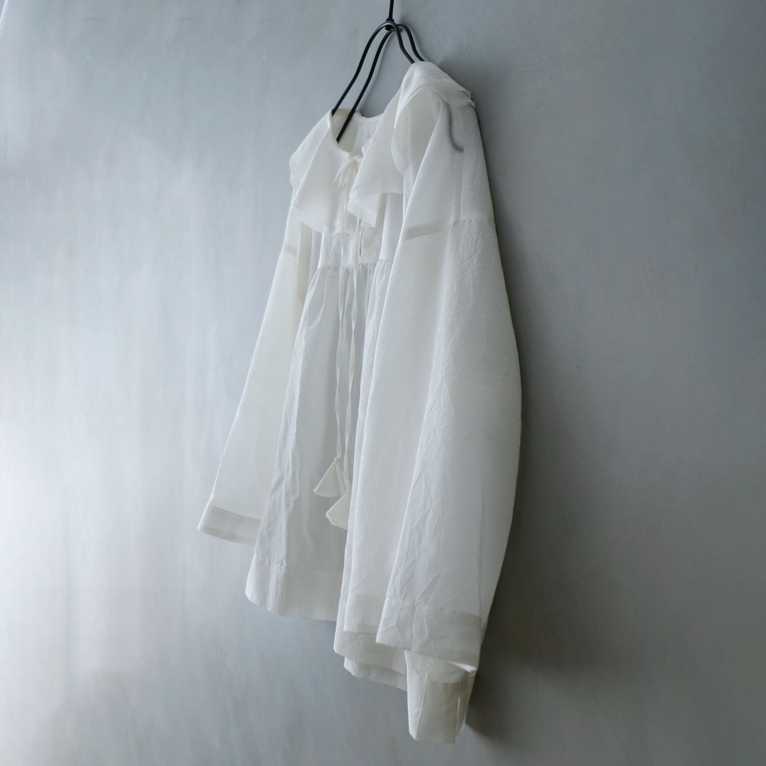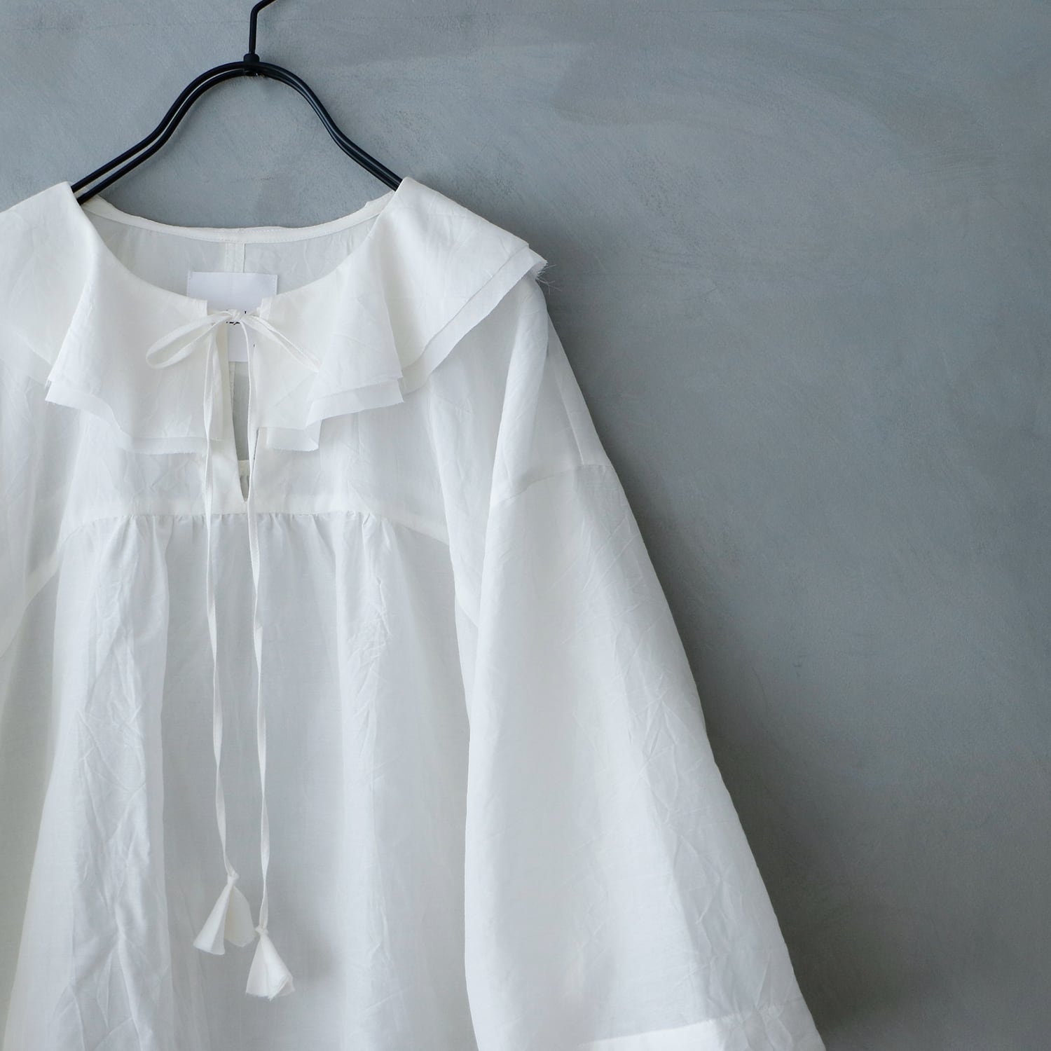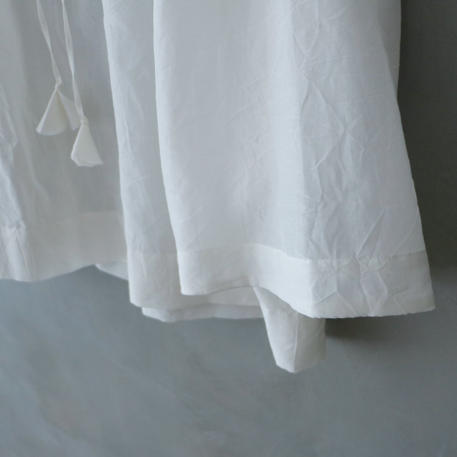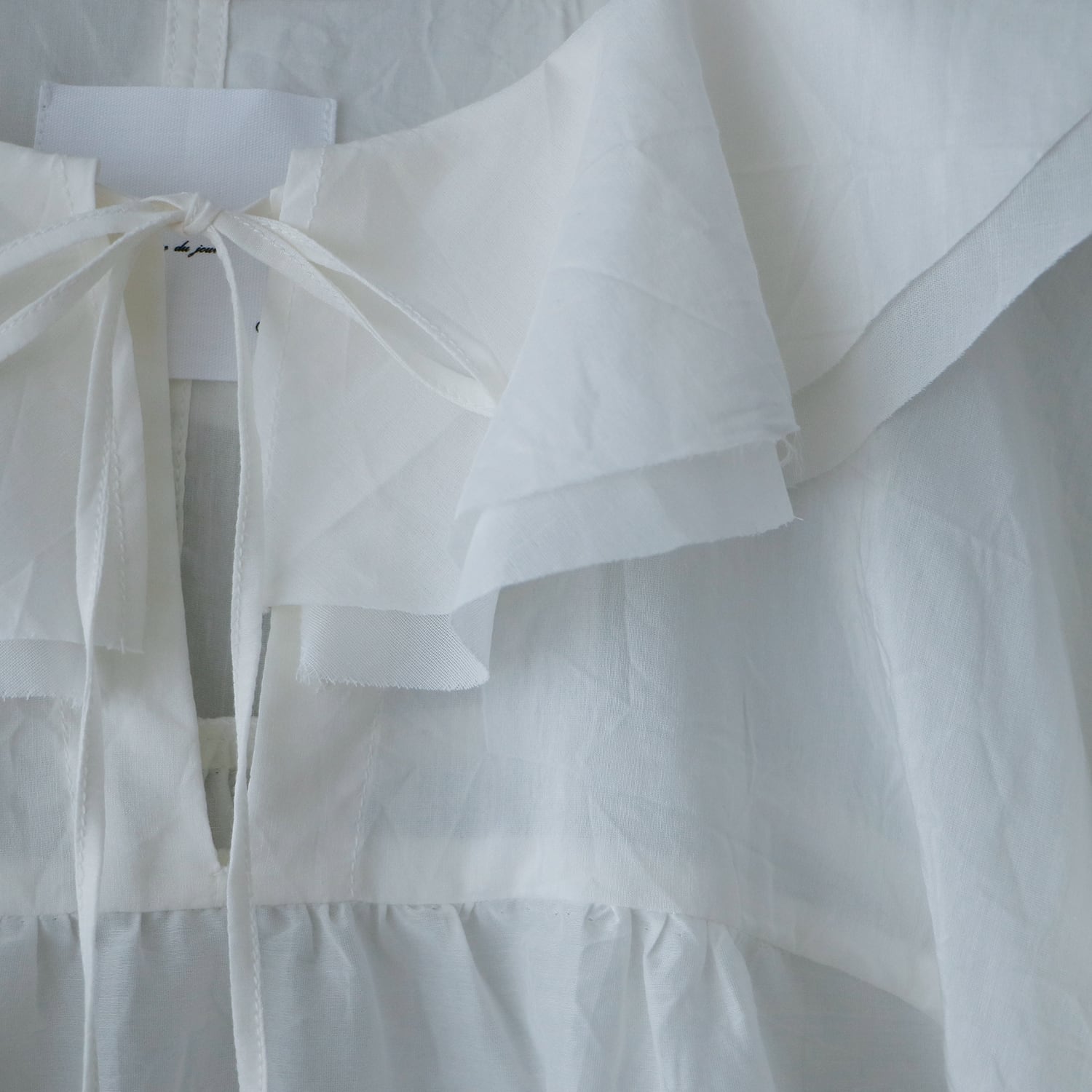 ・フリルは切りっぱなし仕様となっており、着ていくうちにフリルは古布のように味のある雰囲気に変化していきます。ほつれた糸はお好みでカットして取り除いてください。