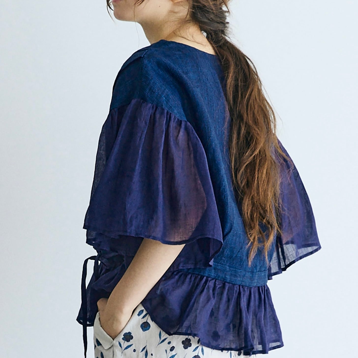 袖と裾のフリル部分にはリネンラミーの涼やかなローン生地が使われています。