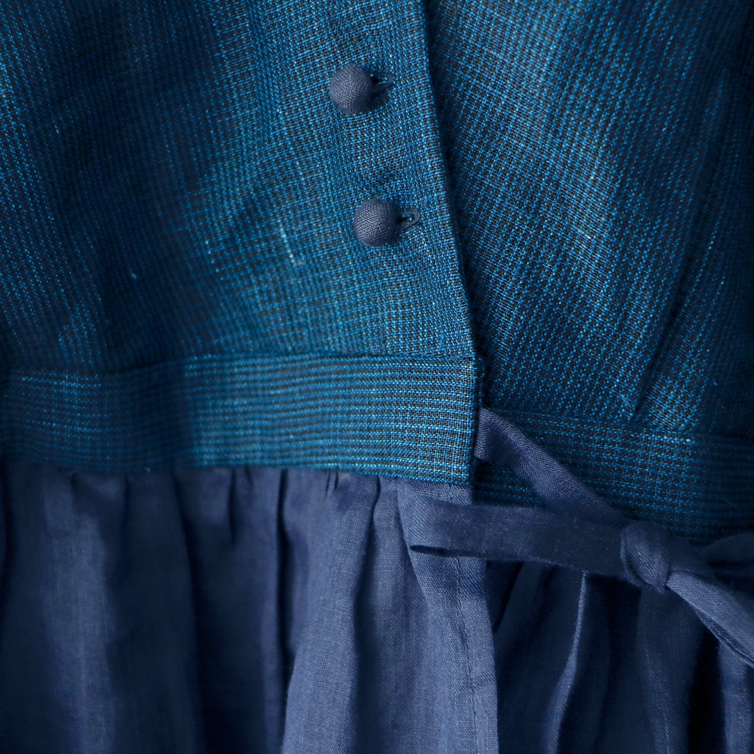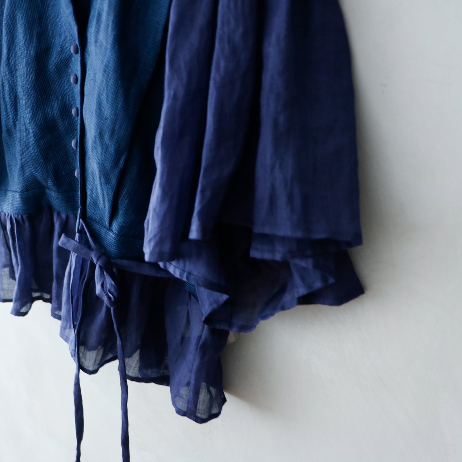 素材は小さなチェック柄と色むら感に趣のあるインディゴ染めのリネンを使用。
